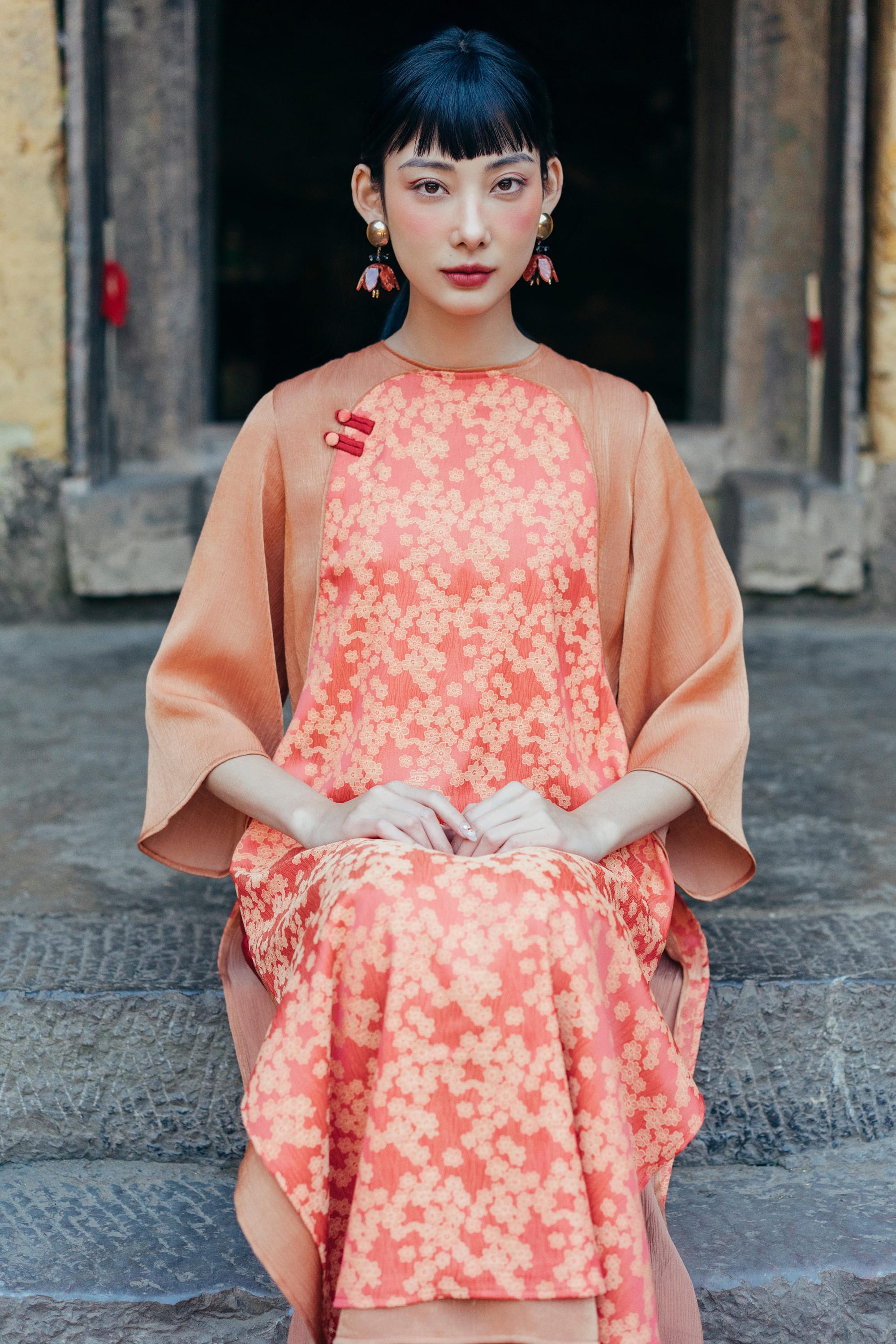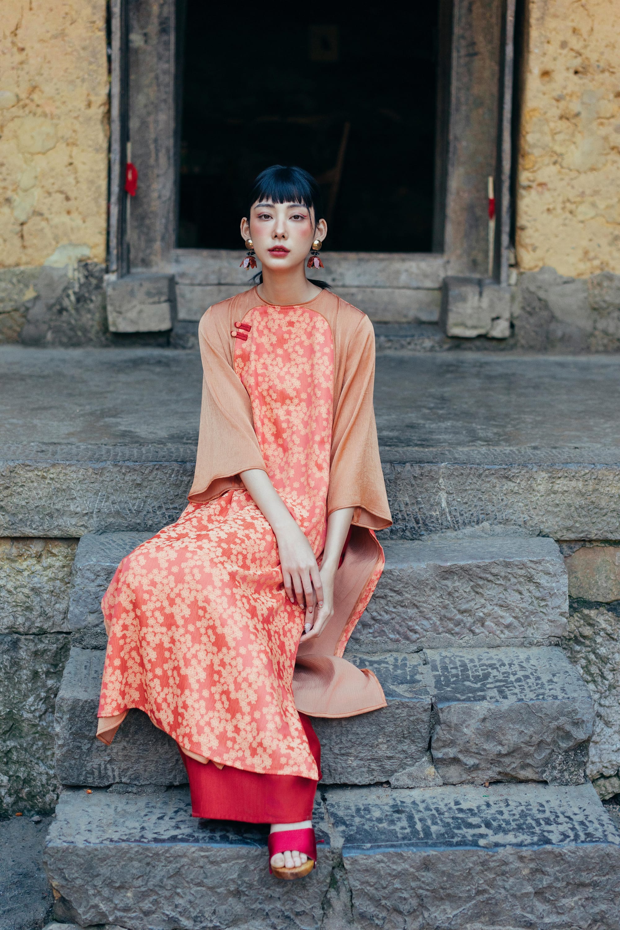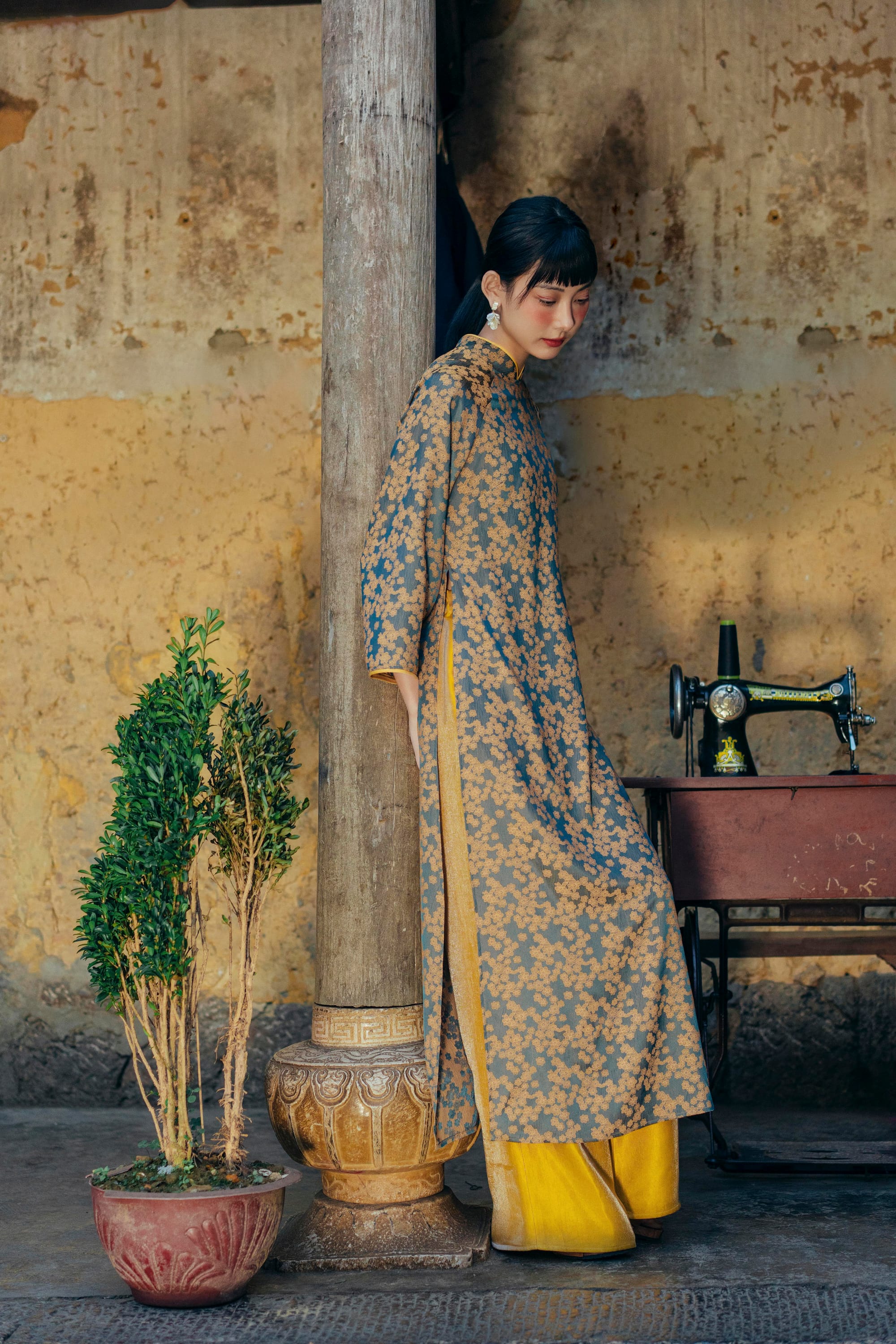 𝐀́𝐨 𝐃𝐚̀𝐢 𝐇𝐨𝐚̀𝐢 𝐏𝐡𝐨̂́ 𝐇𝐨𝐚 - phom suông có chiết nhẹ phần lưng nếu cô Mây muốn có một mẫu Áo trẻ trung nhưng vẫn giữ được nét truyền thông của Áo Dài. Áo với lớp vải nhung bên ngoài, lót lụa hoa bên trong, Mây chắc rằng đây là một trải nghiệm mặc thú vị nhất trong những năm qua đấy nhé.